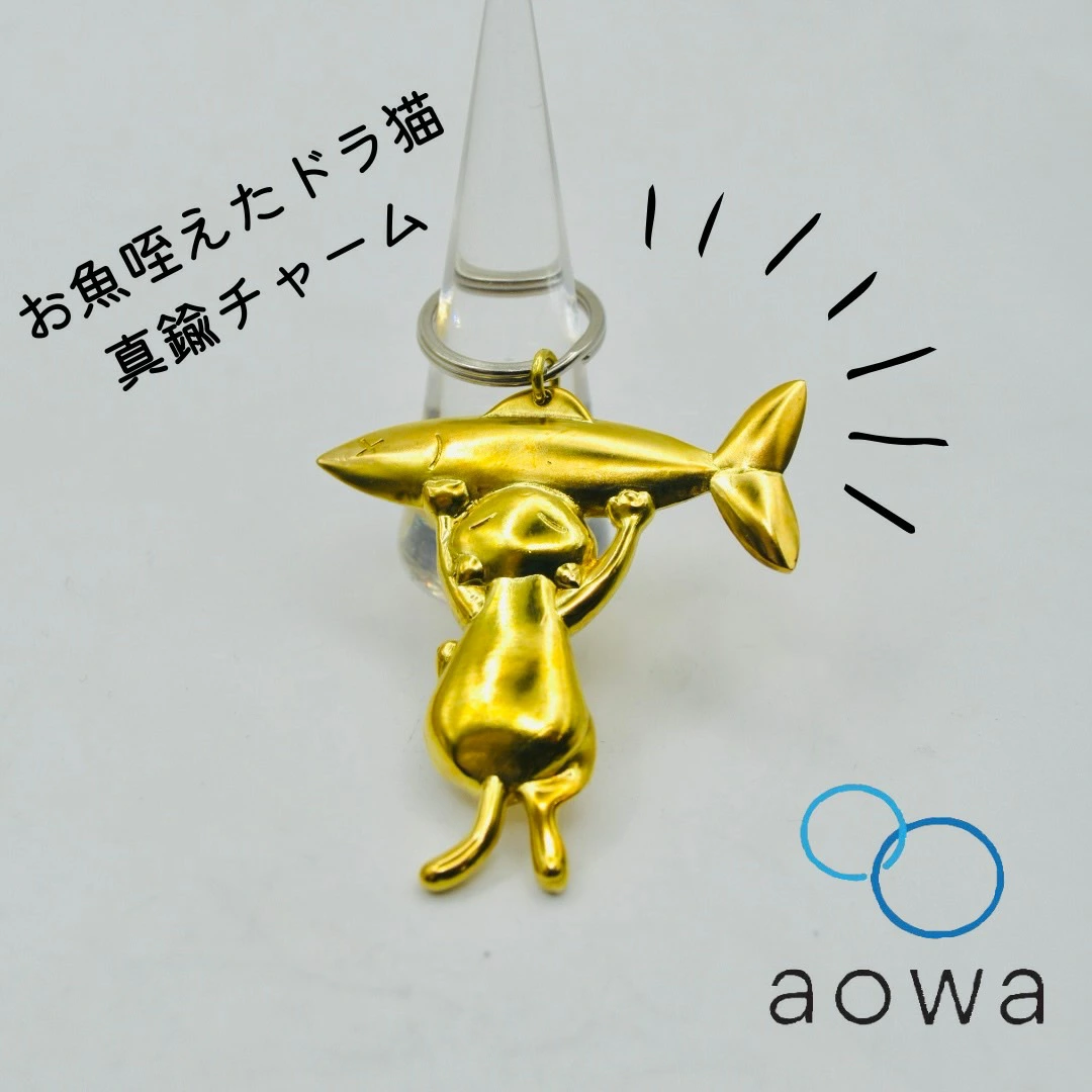 「送料無料」 どこに付けても可愛い 幸運呼びそう!お魚咥えたドラ猫チャーム キーホルダー 真鍮